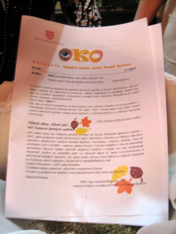 Počas celého mesiaca bol pre seniorov pripravený bohatý program. Nechýbali v ňom koncerty, Olympiáda seniorov, prednášky, či poradenstvo o zdraví. Aj tento rok sa do pripravených aktivít zapojili stovky seniorov z DC mesta Banská Bystrica a práve o ich aktivitách sme vydali nový občasník “OKO”, ktorý mali možnosť pokrstiť krstní rodičia a to: prvý viceprimátor mesta Banská Bystrica Mgr. Jakub Gajdošík a vedúca Odboru sociálnych veci mesta Banská Bystrica PhDr. Ing. Ivana Kružliaková PhD.